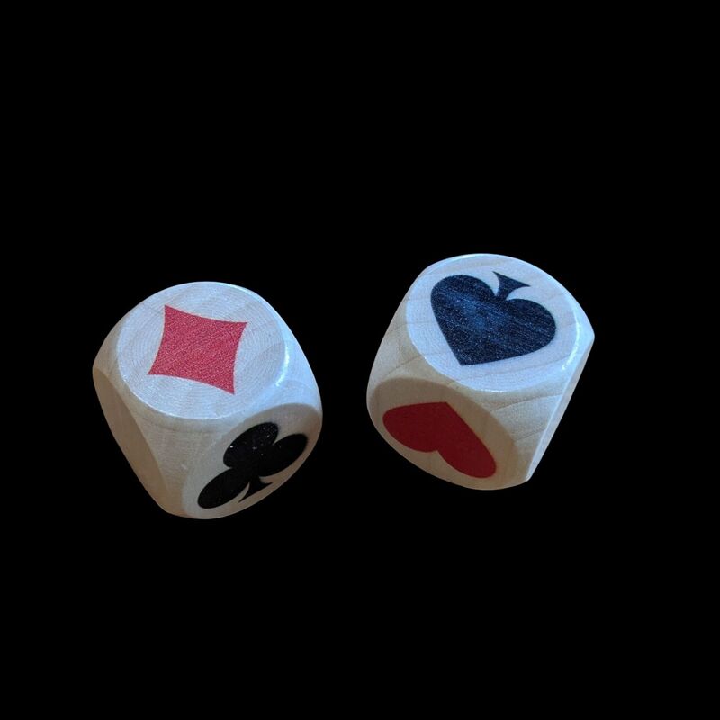dé en bois avec 4 atouts imprimés et 2 faces libres.