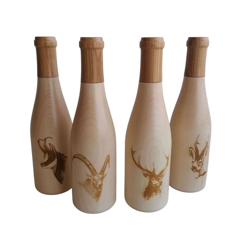 moulins à poivre ou sel en forme de bouteille, corps en érable goulot en cerisier.